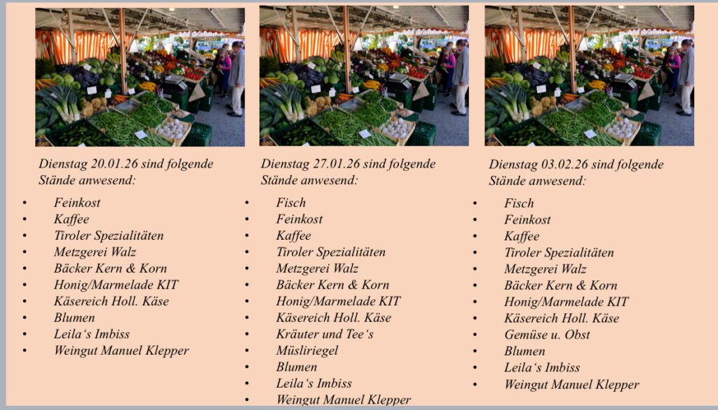 bedingt durch Urlaube und Beschickerwechsel ist es in den letzten Wochen zu einigen Ausfällen unseres vielseitigen Angebots gekommen (siehe Grafik). Spätestens am 03.02. werden wir Euch wieder das komplette Sortiment (dann auch mit neuem Obst- und Gemüsestand) anbieten können.